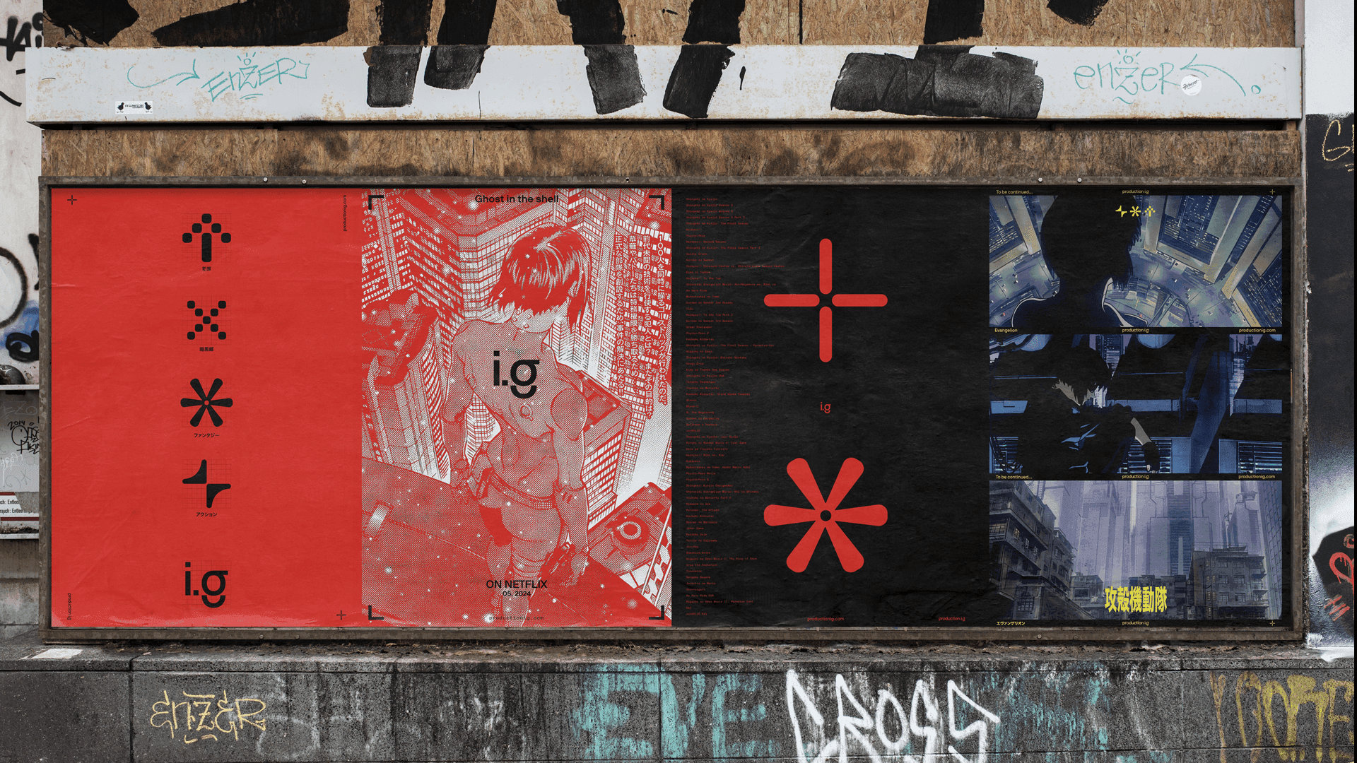 In the rebranding of Production I.G., animation principles were transformed into a dynamic visual system, using bold typography and motion-driven graphics to create a fluid, evolving identity.